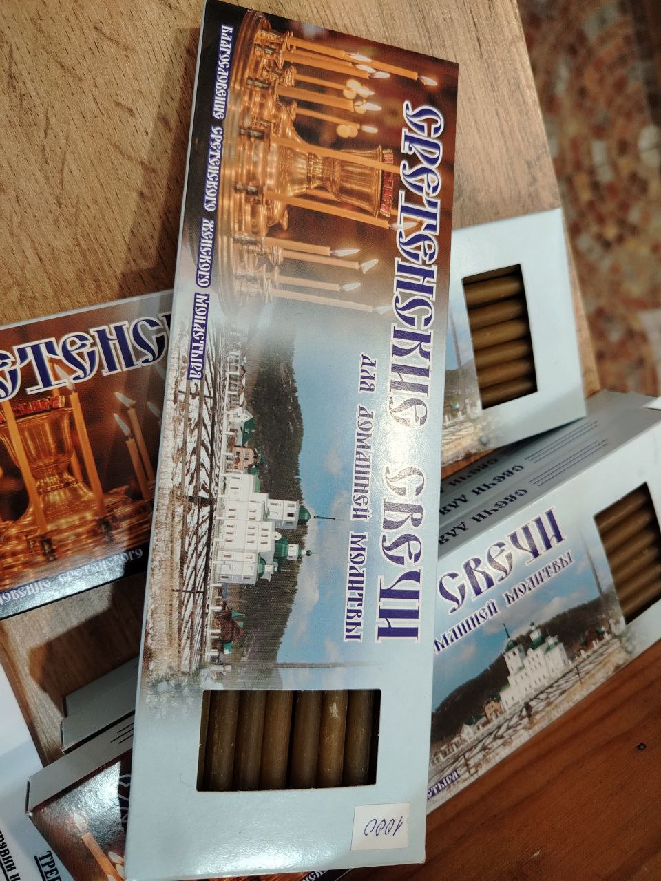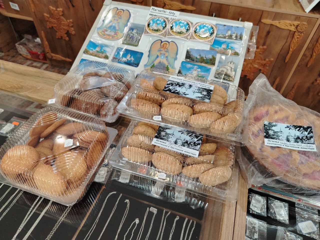 Заглядываю в помещение по соседству – церковную лавку – и дивлюсь ее ассортименту. Чего здесь только нет! Баночки с медом с шишками и орехами со своей пасеки, зеленый и черный чай с клубникой, варенье, соленья, выпечка и свечи собственного производства, а также масла, иконы, книги, крестики, платки, браслеты, благовония от специализированных производителей.