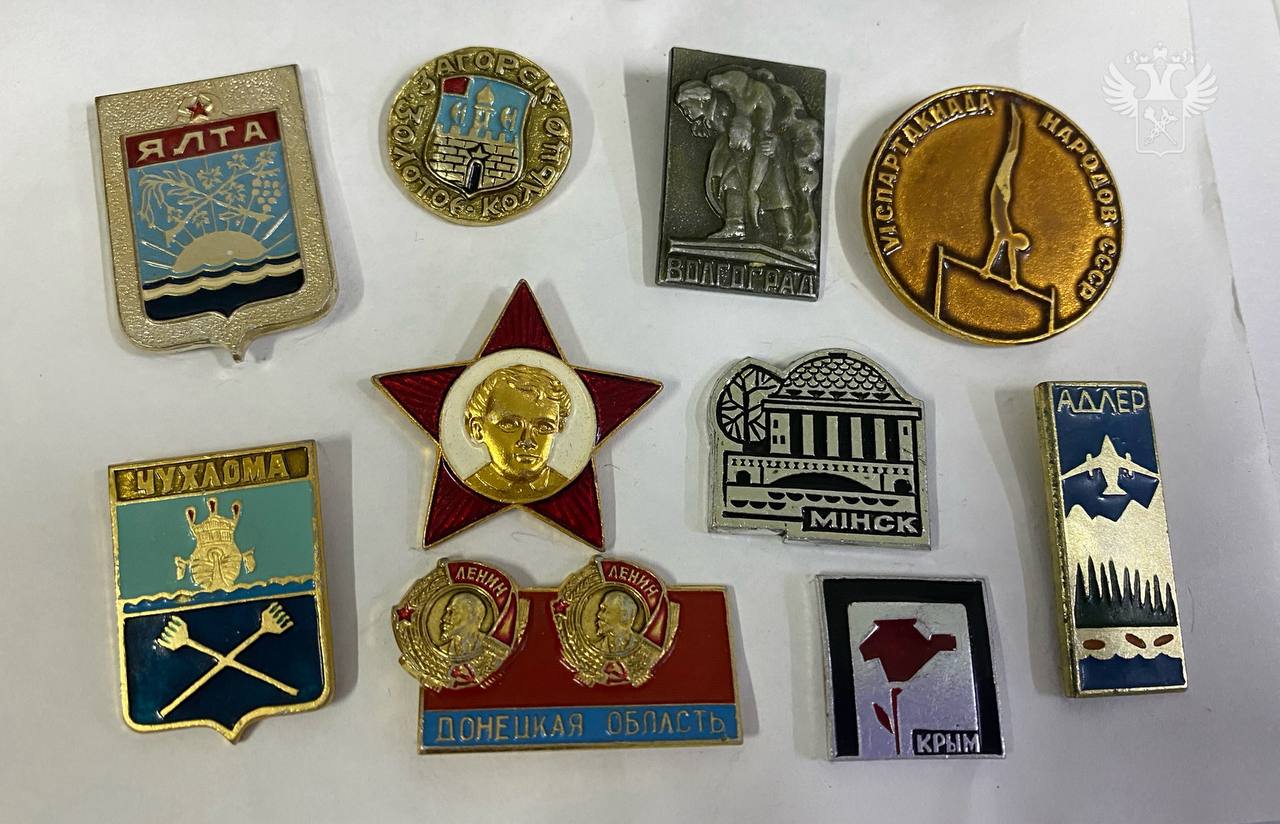 В его чемодане нашли 77 нагрудных знаков, в том числе «Готов к труду и обороне СССР», «Брестская крепость», «Нарвские ворота. Ленинград», «Древний герб. Медынь», «Ударник XI пятилетки», «Перекоп 1920-1944», Спартакиада народов СССР» и многие другие, а также монету «1 рубль СССР».