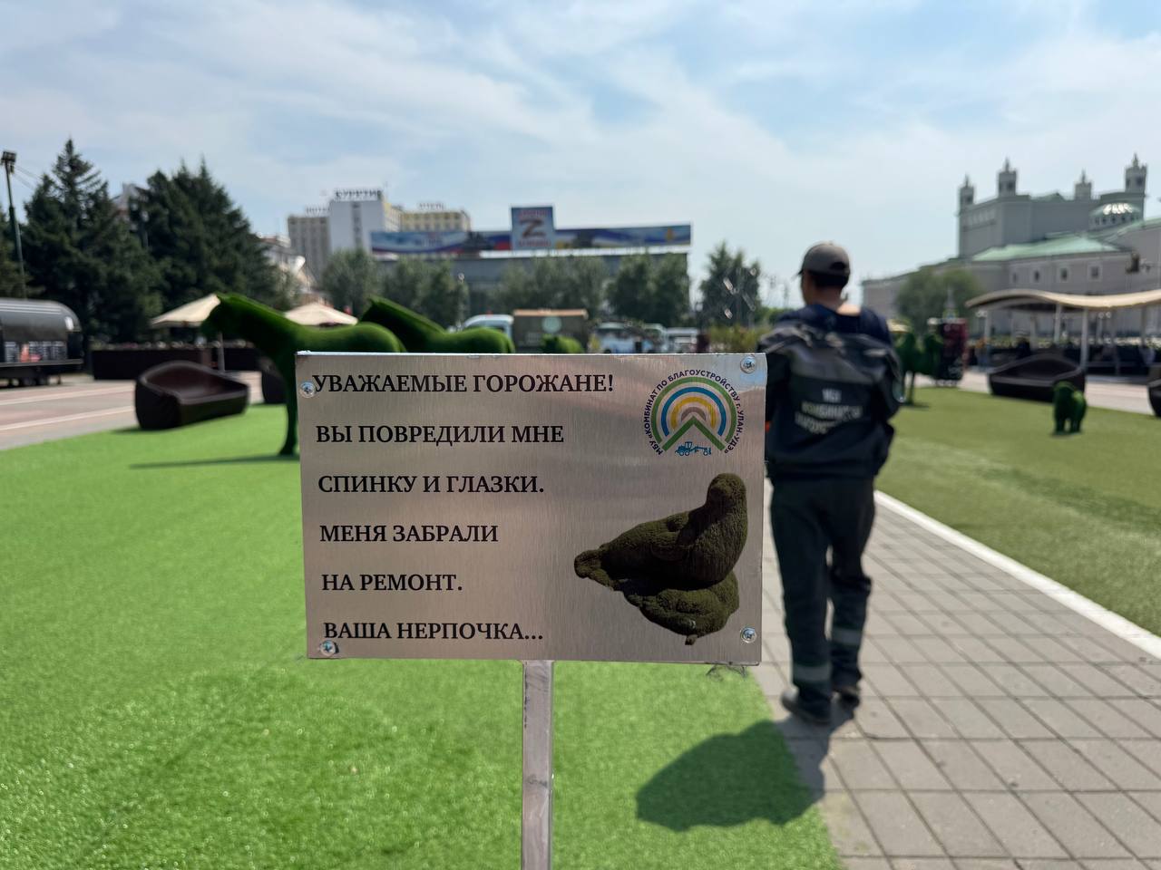 В центре Улан-Удэ из-за действий вандалов снова пострадали топиарии – нерпа и бык. У зверей из искусственной травы разорваны лапы и уши, глубокие царапины на спинке, а также оторваны глаза. Бык и вовсе пострадал в четвертый раз.