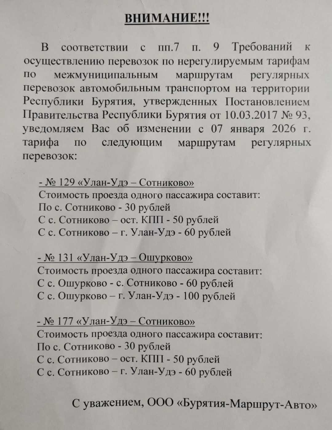 Поездка на автобусах № 129 и 177 по Сотниково будет стоить 30 рублей, до остановки «КПП» – 50, а до Улан-Удэ – 60. На автобусе № 131 между Ошурково и Сотниково она обойдется в 60 рублей, а от Ошурково до Улан-Удэ – аж в сто рублей.