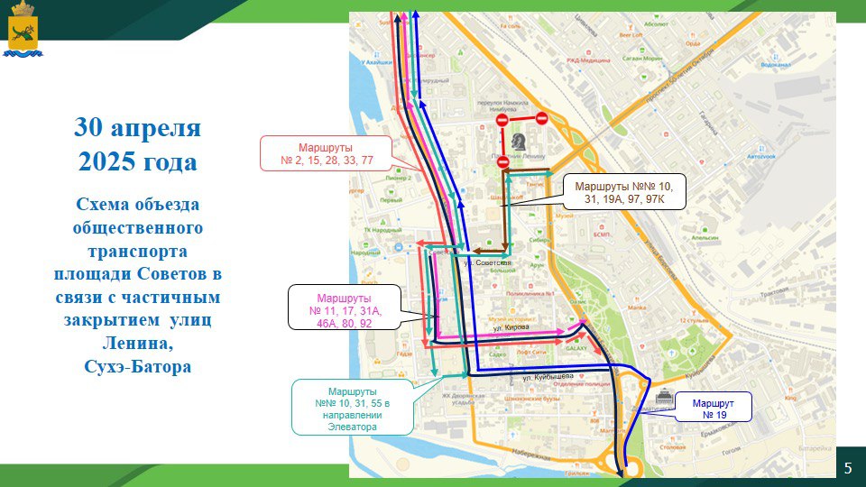 Временные изменения коснутся следующих маршрутов% № 2, 10, 11, 15, 17, 19, 19А, 28, 31, 31К, 33, 46А, 55, 77, 80, 92, 97, 97К. Они поедут объездными путями из-за частичного закрытия центральных улиц – Сухэ-Батора и Ленина.