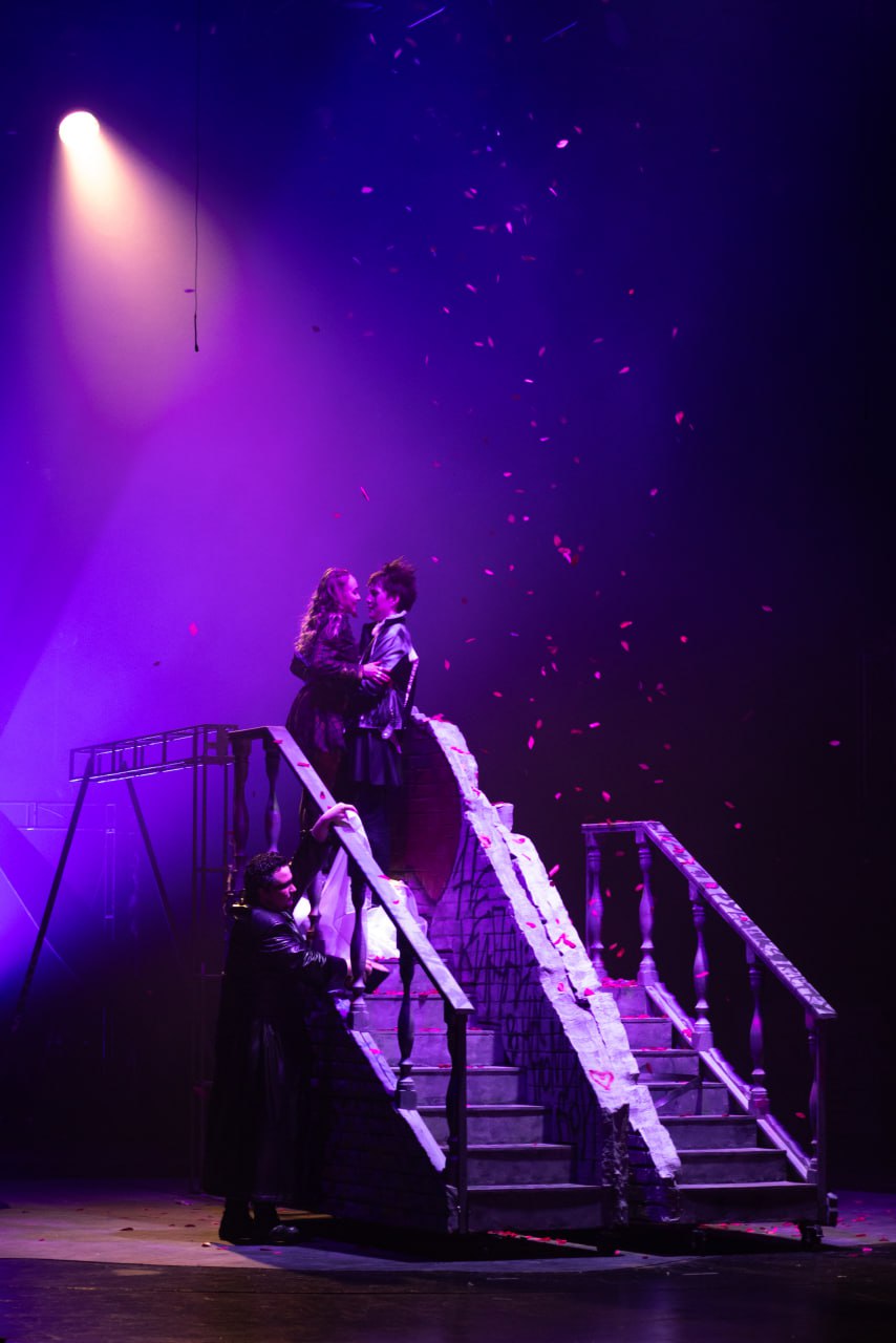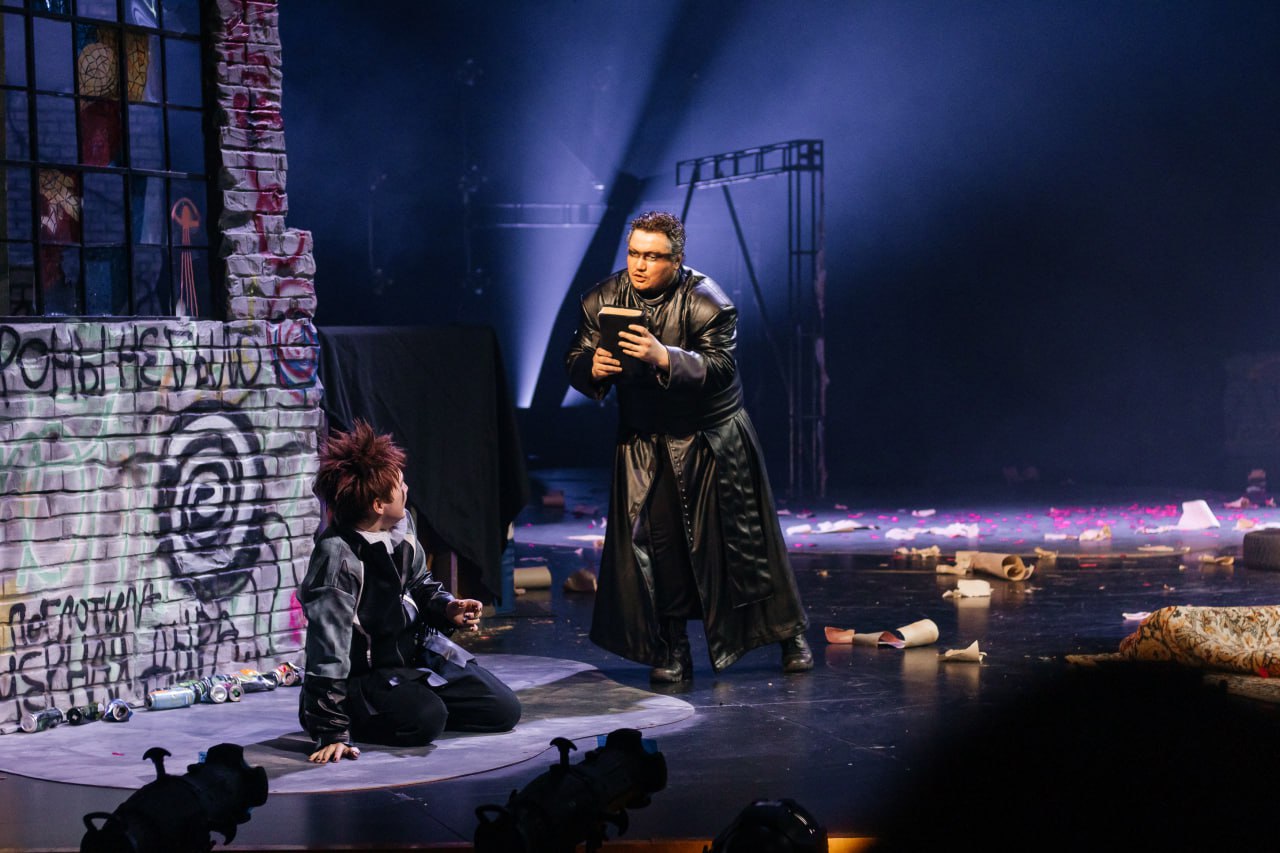 Отдельная песня – работа молодого художника-постановщика. Саяна Урбадаева вместе с режиссером-постановщиком искала идеи для нового прочтения и, судя по всему, нашла их в гардеробе сразу двух эпох. Род Капулетти щеголяет в одежде с рисунком в клетку, а род Монтекки облачился в кожу. Ирония судьбы: при всей любви к панку средневековый дух в нарядах все же угадывается. То есть если вы вдруг забудете, что действие происходит в старой доброй Вероне, костюмы напомнят: нет, ребята, это точно не «Битва экстрасенсов» (18+)