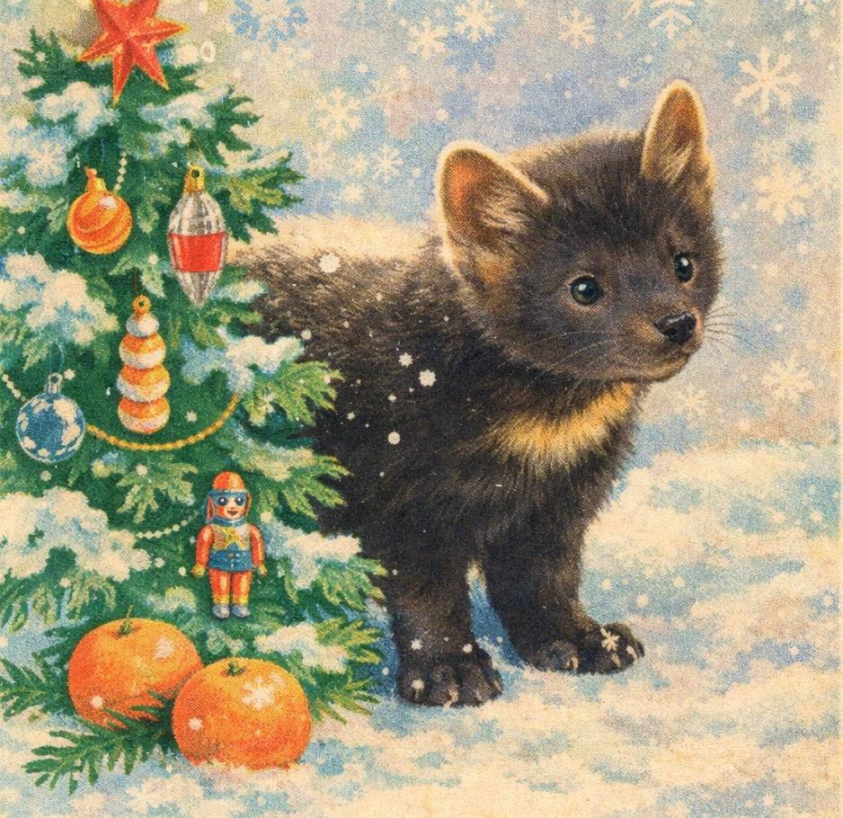Вместо современных сверхчетких снимков – композиции, сошедшие с поздравительных карточек прошлого века с атмосферной елкой и забавными животными – соболем, зайцем и белкой.